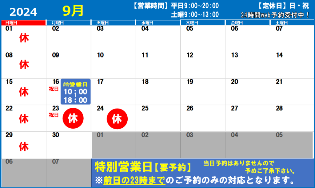 2024年9月の営業日カレンダー